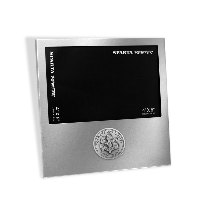 A perfect picture is not complete without preserving and displaying the photos in an elegant picture frame. This aluminum frame displays a 4" x 6" photo and is a great choice to showcase your favorite Colgate memories. The frame has a pewter Colgate Seal.
