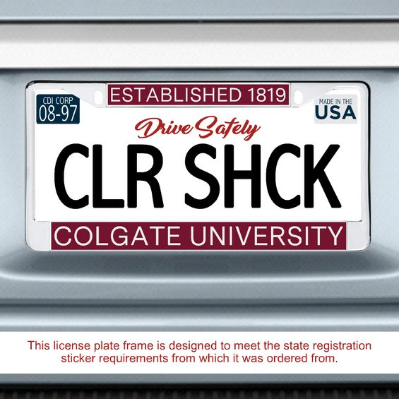 This chrome plated license plate frame is painted with "Established 1819" on top and "Colgate University" on the bottom.