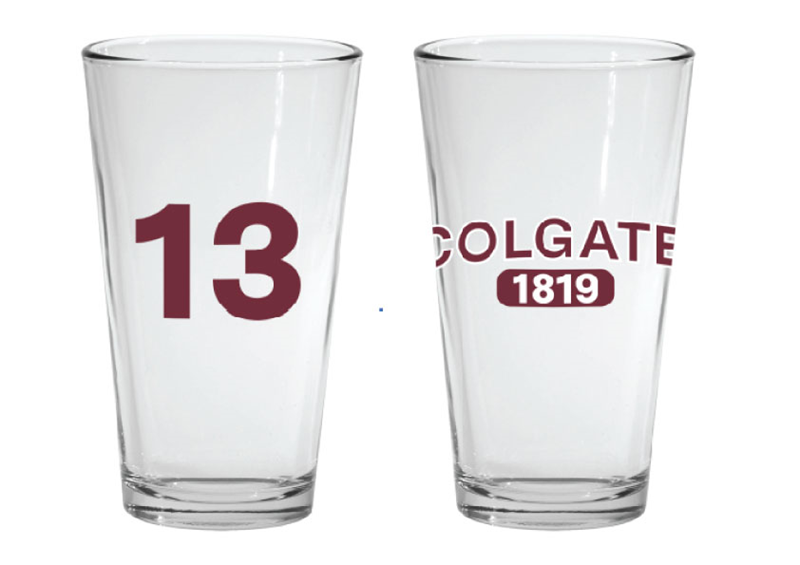 Boast your Colgate pride every time you watch them play with our Pub glass! This 16 oz pub glass has "Colgate 1819" on the front and "13" on the back.