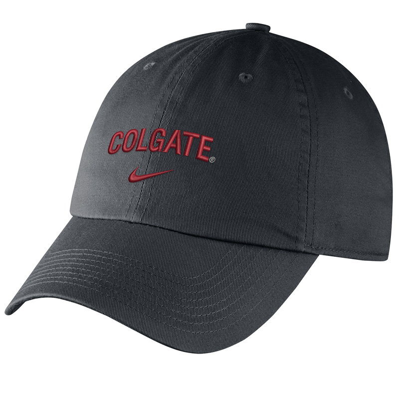 Six panel adjustable washed cap. Soft structure, embroidered eyelets and a totally clean finish adjustable closure. Embroidered Colgate on center front and Swoosh design trademark on wearer’s front panel.